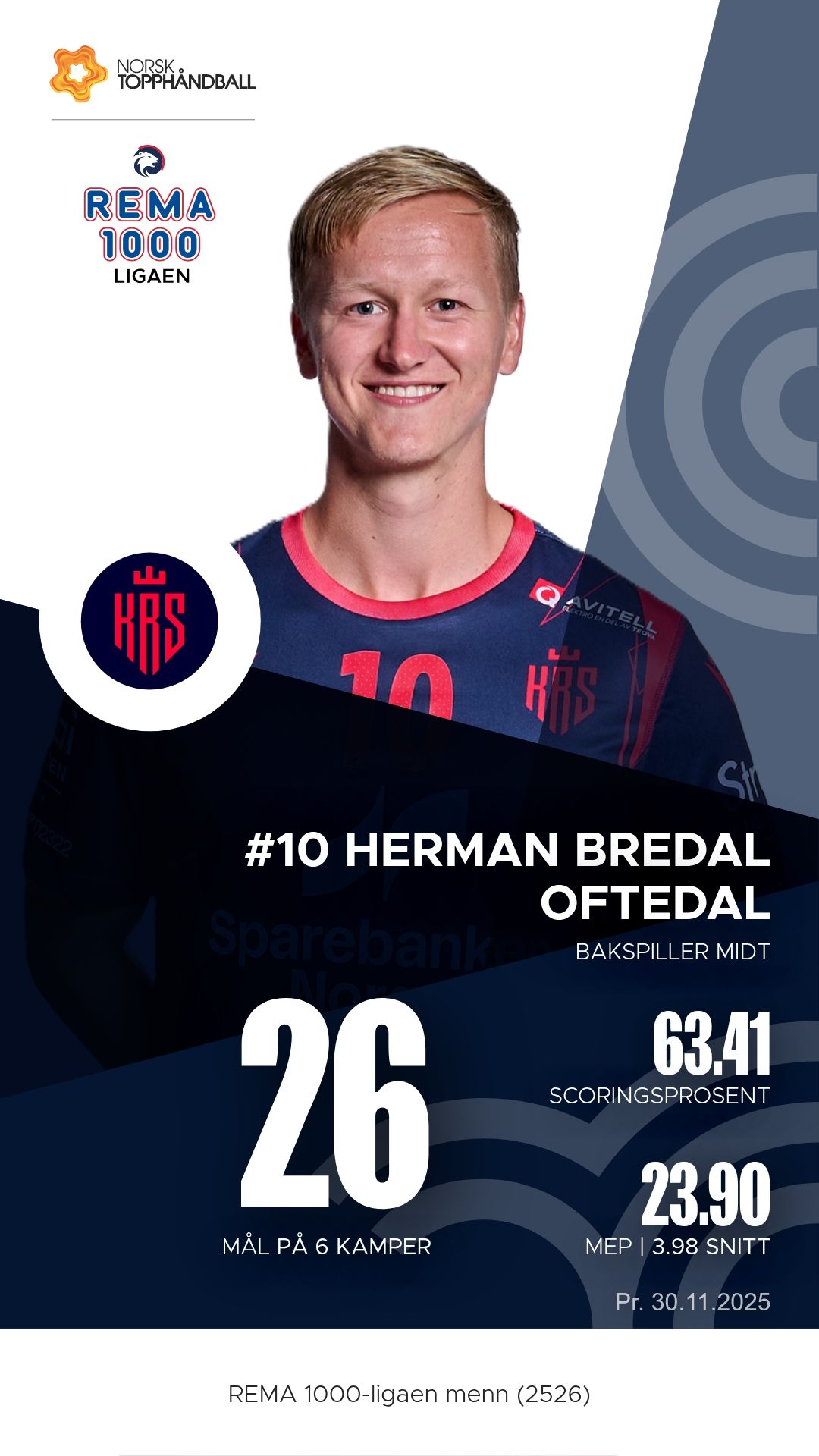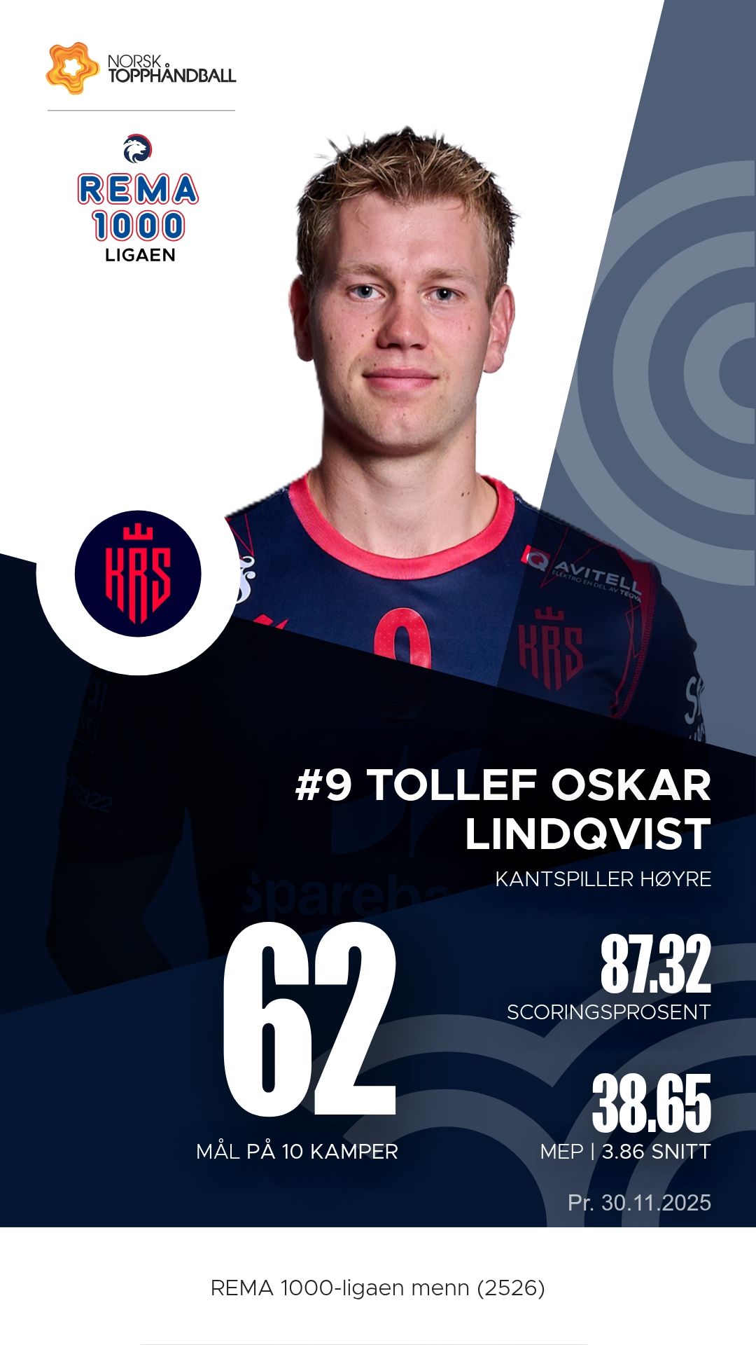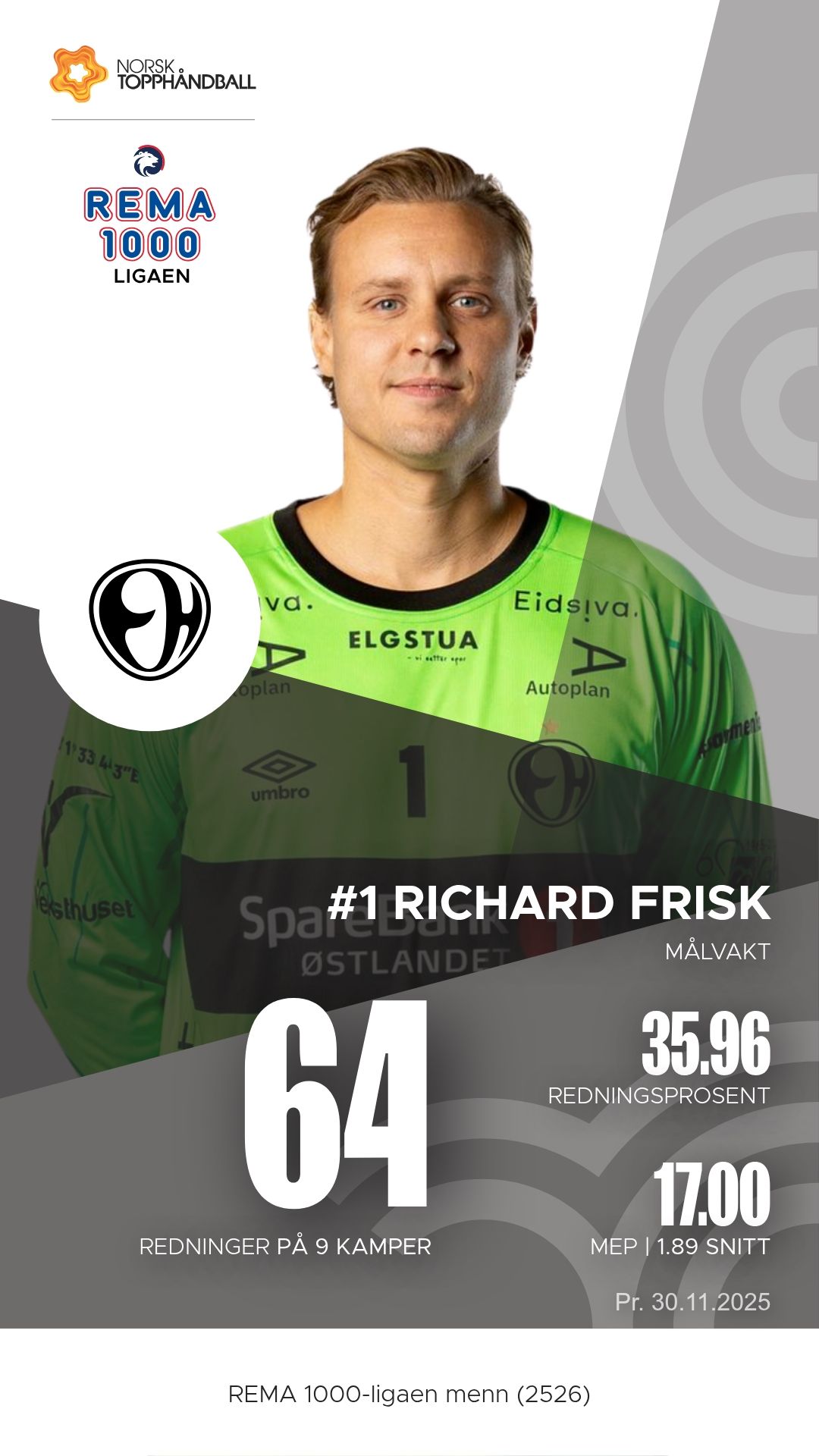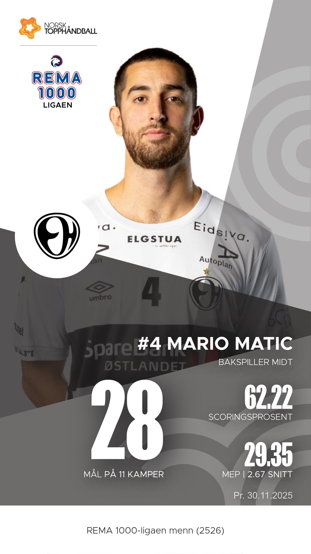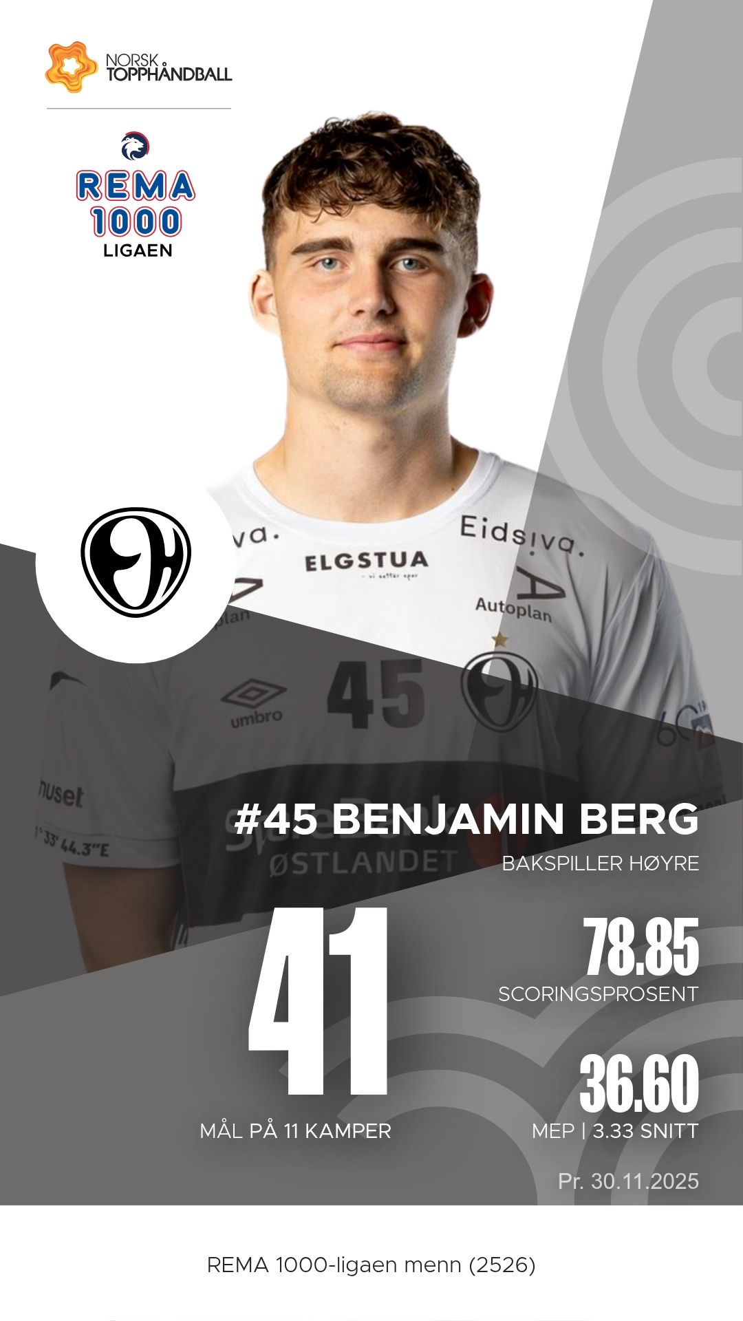 Elverum stiller med et stjernelag som oser kvalitet i alle ledd. Mario Matic styrer spillet med autoritet fra sin playmaker-posisjon, og hans 60 målgivende pasninger så langt viser hvor viktig han er for rytmen i angrepsspillet. På høyre bak finner vi Benjamin Berg, som kombinerer kraft og presisjon med imponerende effektivitet foran mål. Péter Lukács er den kreative motoren som alltid finner rom der andre ser lukkede dører, mens Eirik Kulvedrøsten Soløst og Kevin Maagerø Gulliksen sørger for tempo og kontringskraft fra kantene. I mål står Rickard Frisk, som med sine lynraske refleksredninger ofte blir forskjellen i jevne kamper.