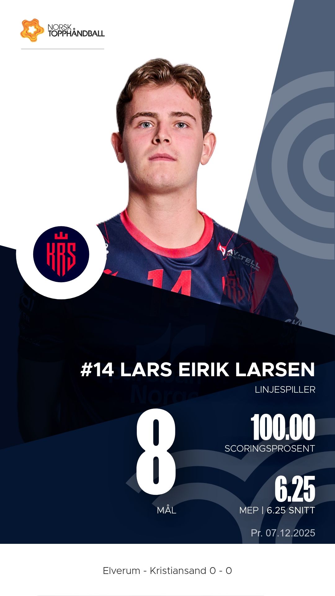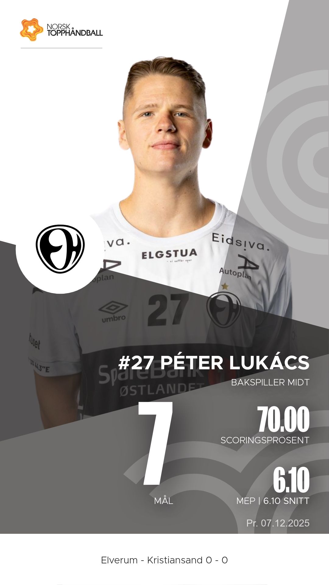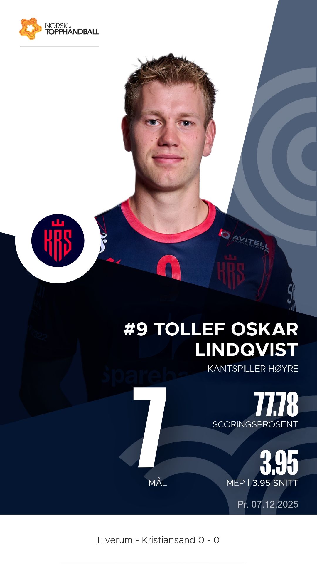 Elverum tok imot Kristiansand Topphåndball til kamp i REMA 1000-ligaen 2025–2026 i Terningen Arena søndag 7. desember. Etter en jevn første omgang dro vertene fra etter pause og vant til slutt 43–33.