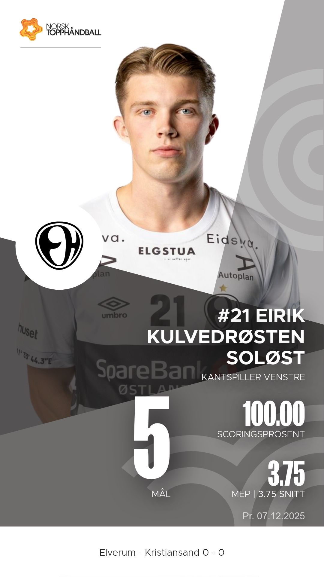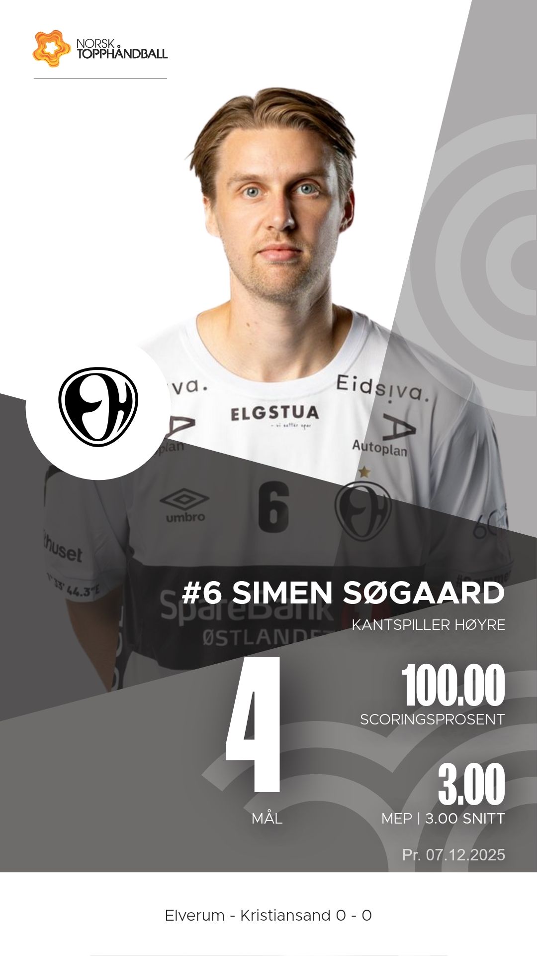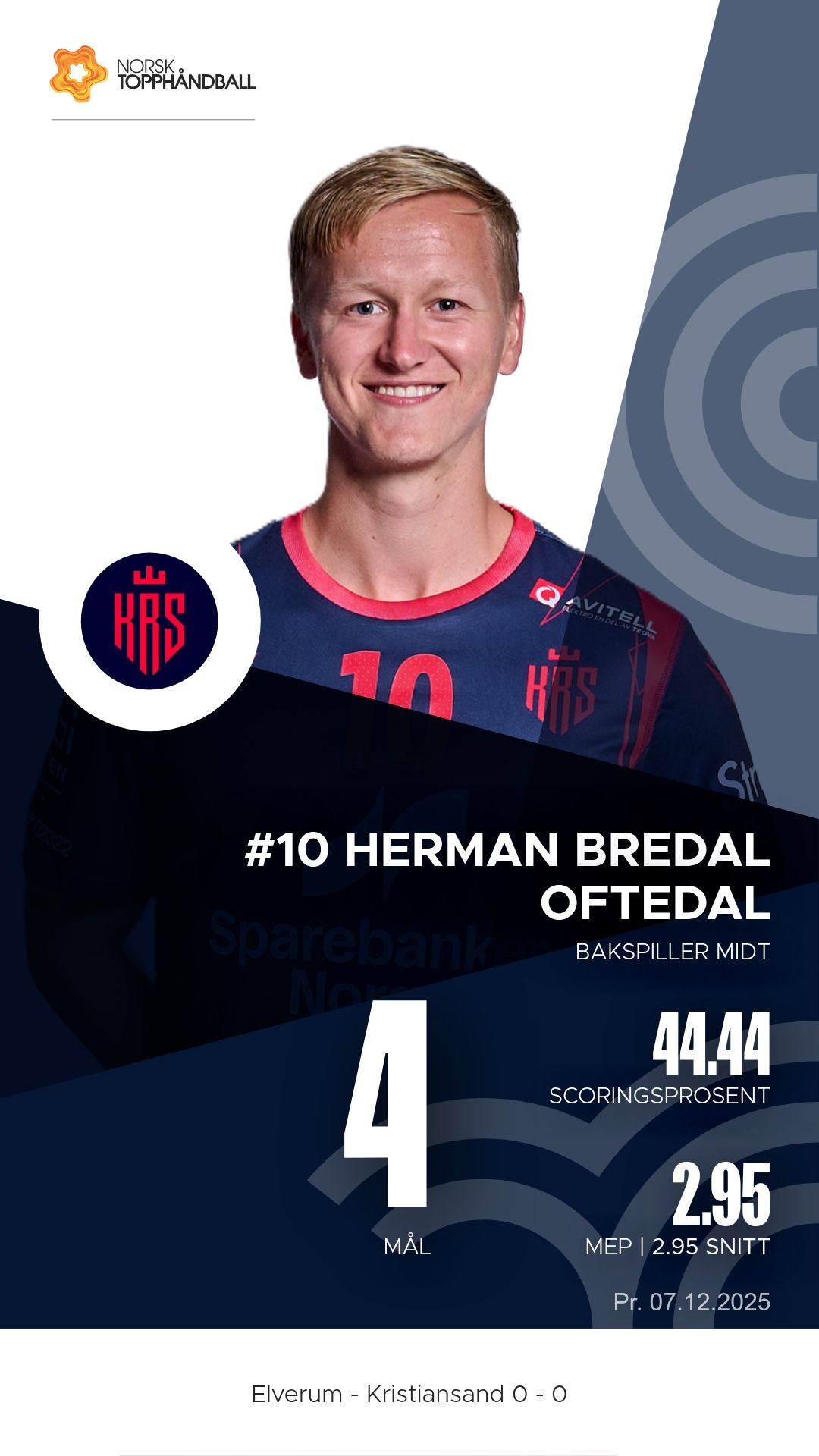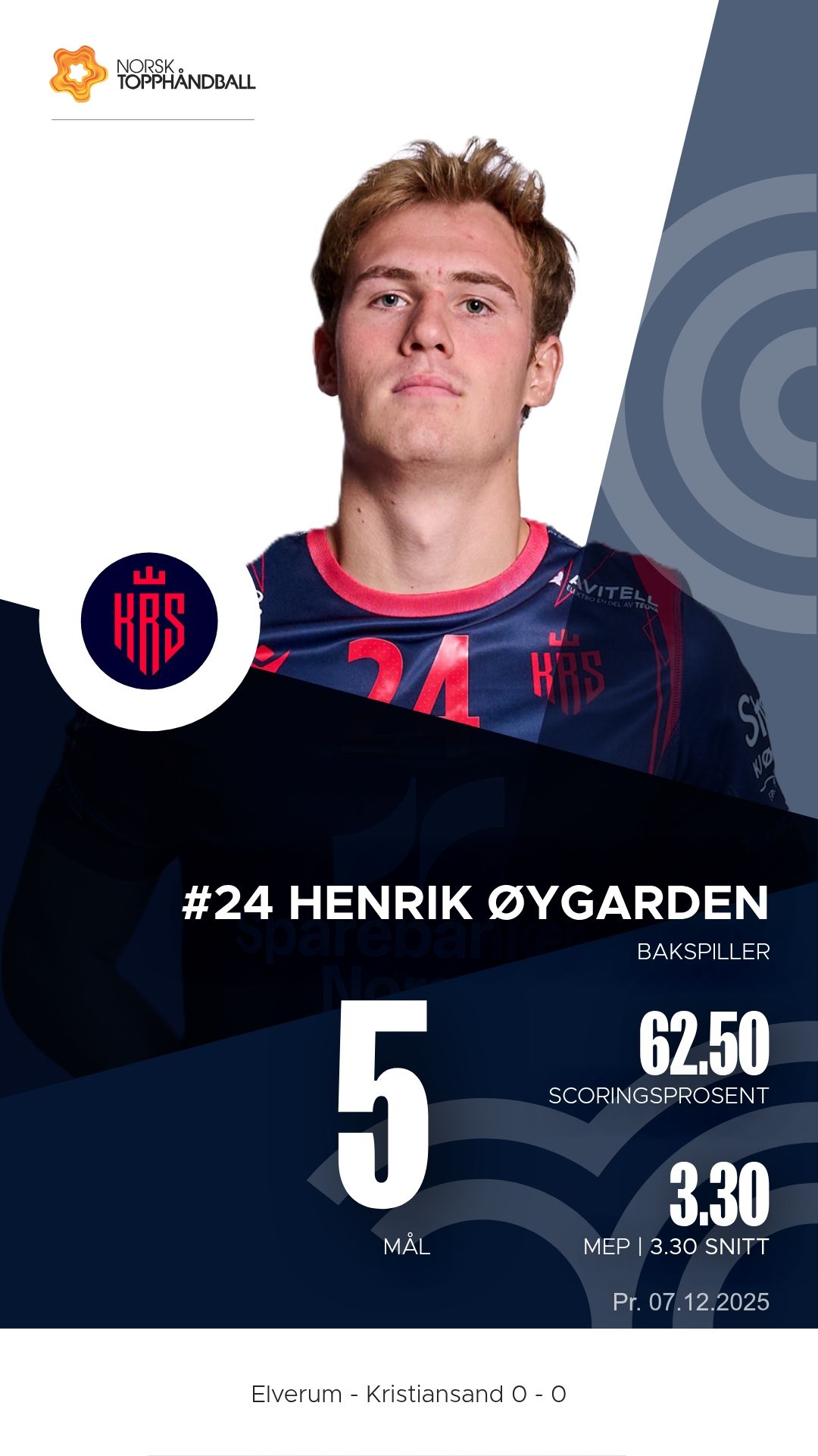 Elverum tok imot Kristiansand Topphåndball til kamp i REMA 1000-ligaen 2025–2026 i Terningen Arena søndag 7. desember. Etter en jevn første omgang dro vertene fra etter pause og vant til slutt 43–33.