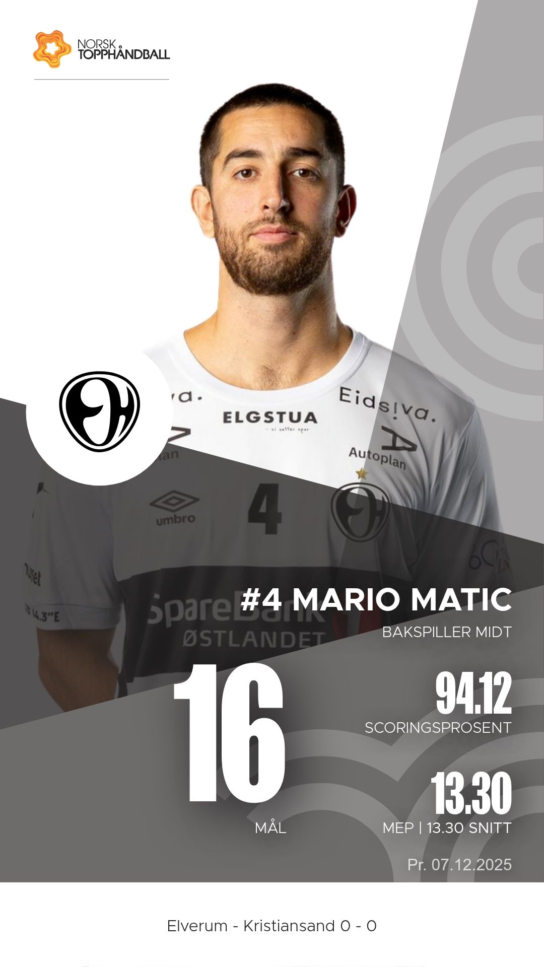 Mario Matic var Elverums ubestridte motor, og spilte en helt vanvittig håndballkamp. Han styrte rytmen i angrepsspillet og endte med imponerende 16 mål og 7 målgivende pasninger. Sjelden har man sett en spiller dominere så kraftig som Matic gjorde i denne kampen. Og spørsmålet blir nå om hans prestasjoner kan gi en plass i Norges EM-tropp i januar!